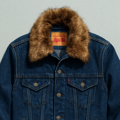 This denim jacket in dark blue features a luxurious fur lining that adds warmth and comfort to your wardrobe. Made with high-quality denim, this jacket is both stylish and practical. Stay cozy and fashionable with this versatile piece.