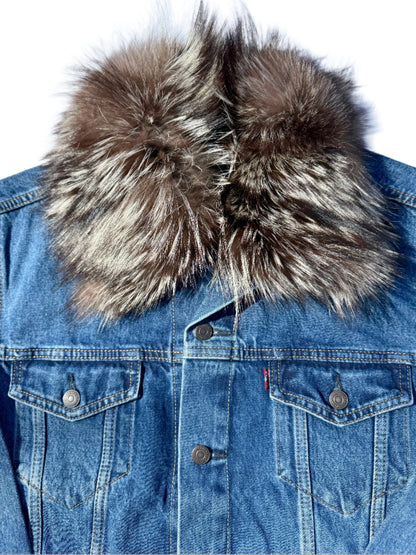 This denim jacket features a stoned wash design and the option to select your fur type, providing a stylish and versatile addition to any wardrobe. Constructed with high-quality denim and luxurious fur, this jacket offers both durability and comfort. Elevate your look with this expertly crafted and customizable piece.